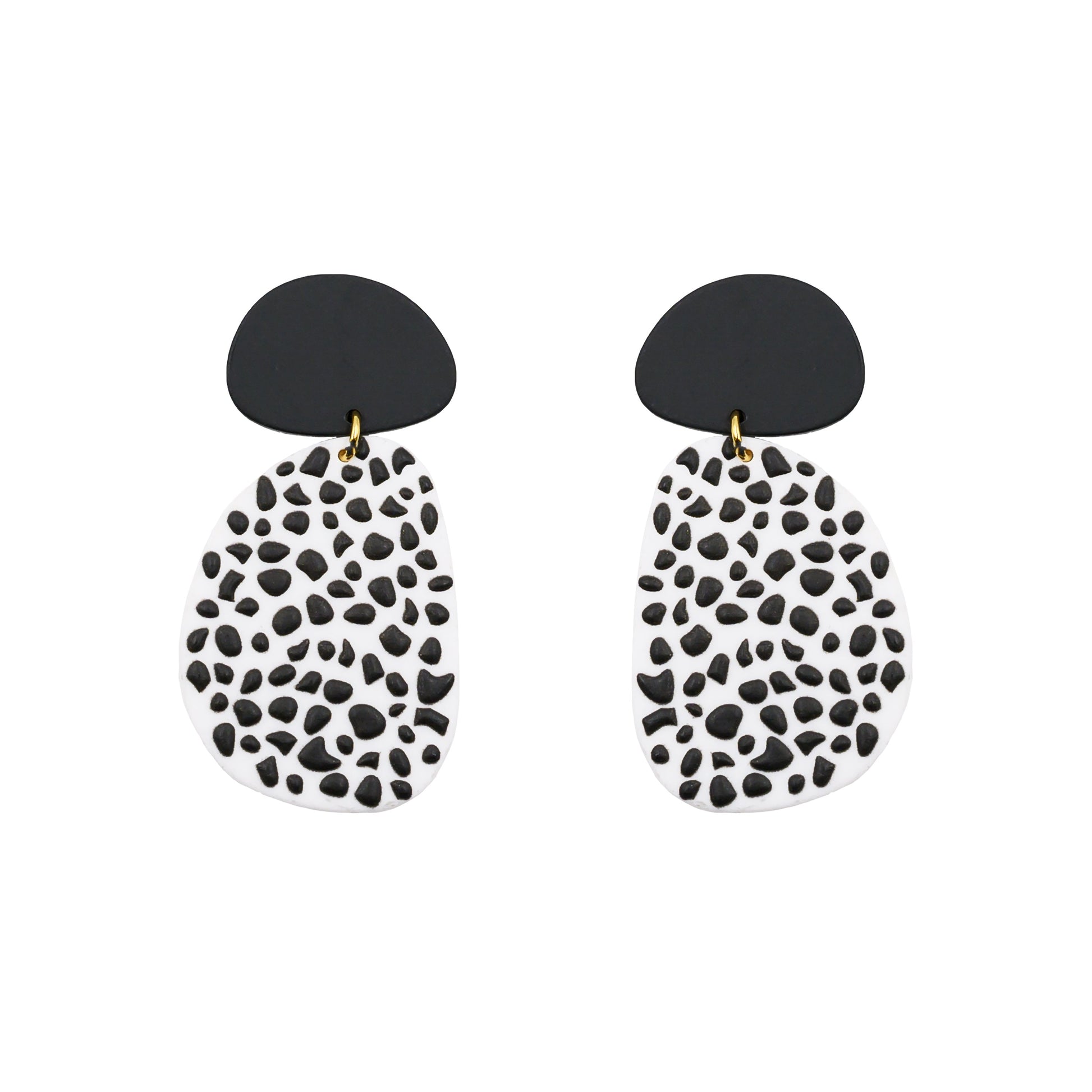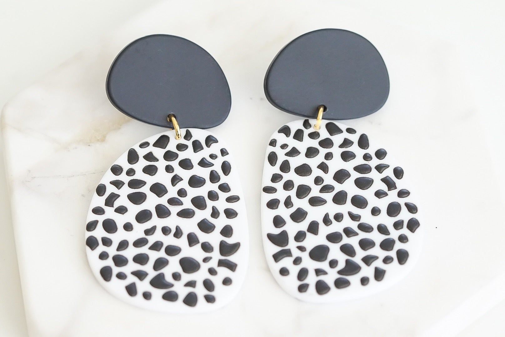 Gold And White Dalmatian Dotted Stud Tiered Featherweight Hypoallergenic Nickel Free Statement Drop Earrings. Custom Lucite Acrylic Geometric Shapes Accents And Designed With Love In Texas. Size 1.5 Inches width x 2.5 Inches Length With Custom Sizing Available On Select Pieces.