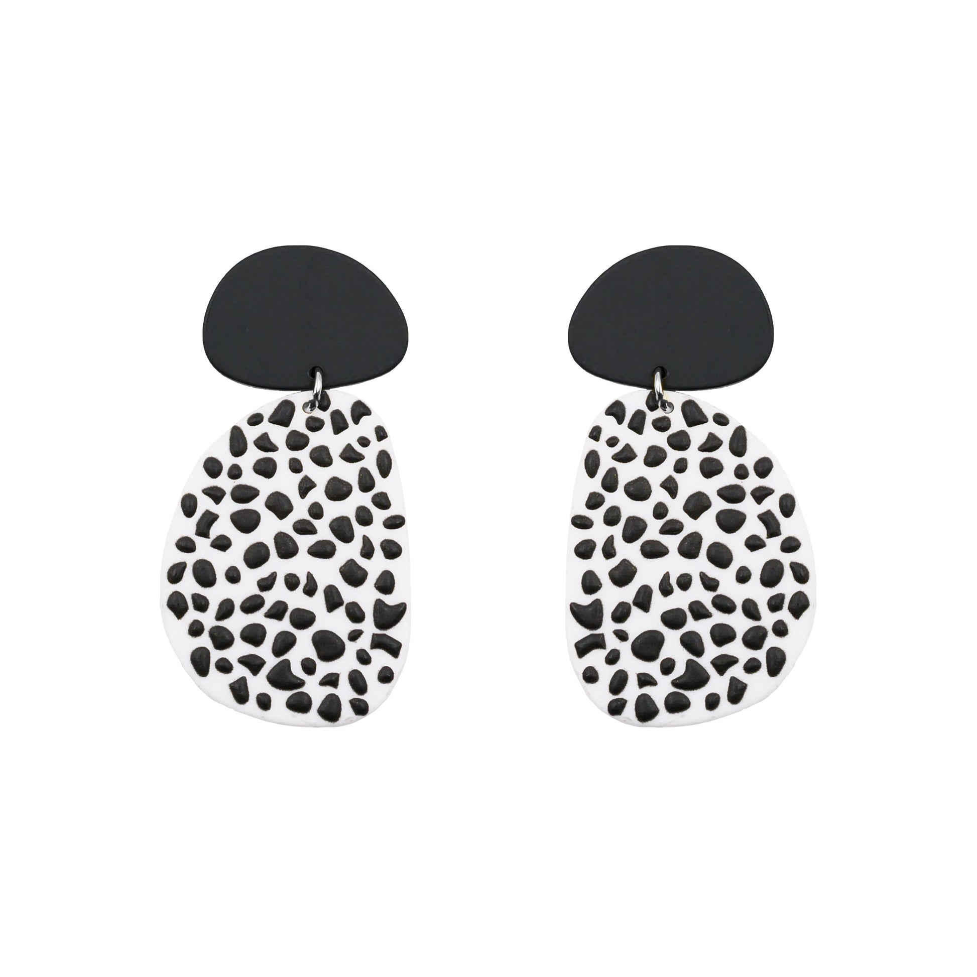 Silver And White Dalmatian Dotted Stud Tiered Featherweight Hypoallergenic Nickel Free Statement Drop Earrings. Custom Lucite Acrylic Geometric Shapes Accents And Designed With Love In Texas. Size 1.5 Inches width x 2.5 Inches Length With Custom Sizing Available On Select Pieces.