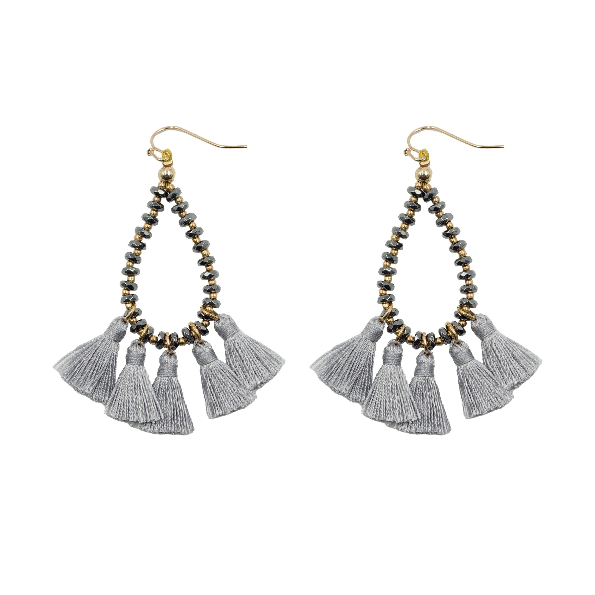 Gold And Gray Featherweight Hypoallergenic Nickel Free Drop Earrings. Custom Linen Tassels Accents And Designed With Love In Texas. Size 2.25 Inches Length x 0.75 Inches Width With Custom Sizing Available On Select Pieces.