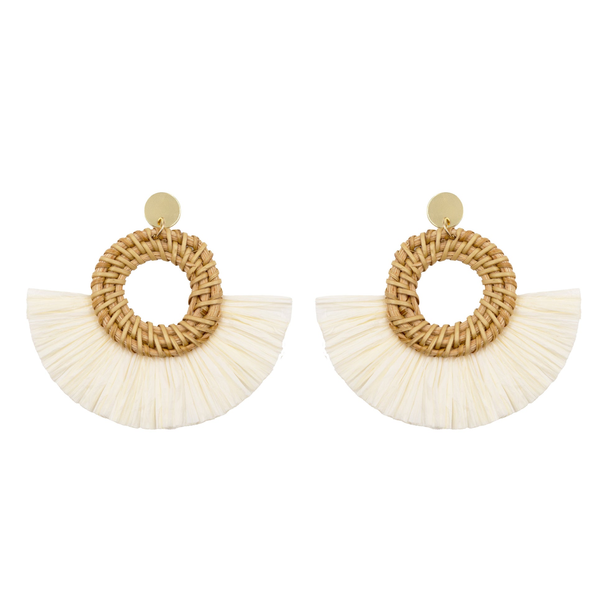 Gold And White Boho Bold Cream Fringe Geometric Lightweight Hypoallergenic Nickel Free Statement Drop Earrings. Custom Straw Geometric Shapes Accents And Designed With Love In Texas. Size 3.0 Inches Length x 3.20 Inches Width With Custom Sizing Available On Select Pieces.