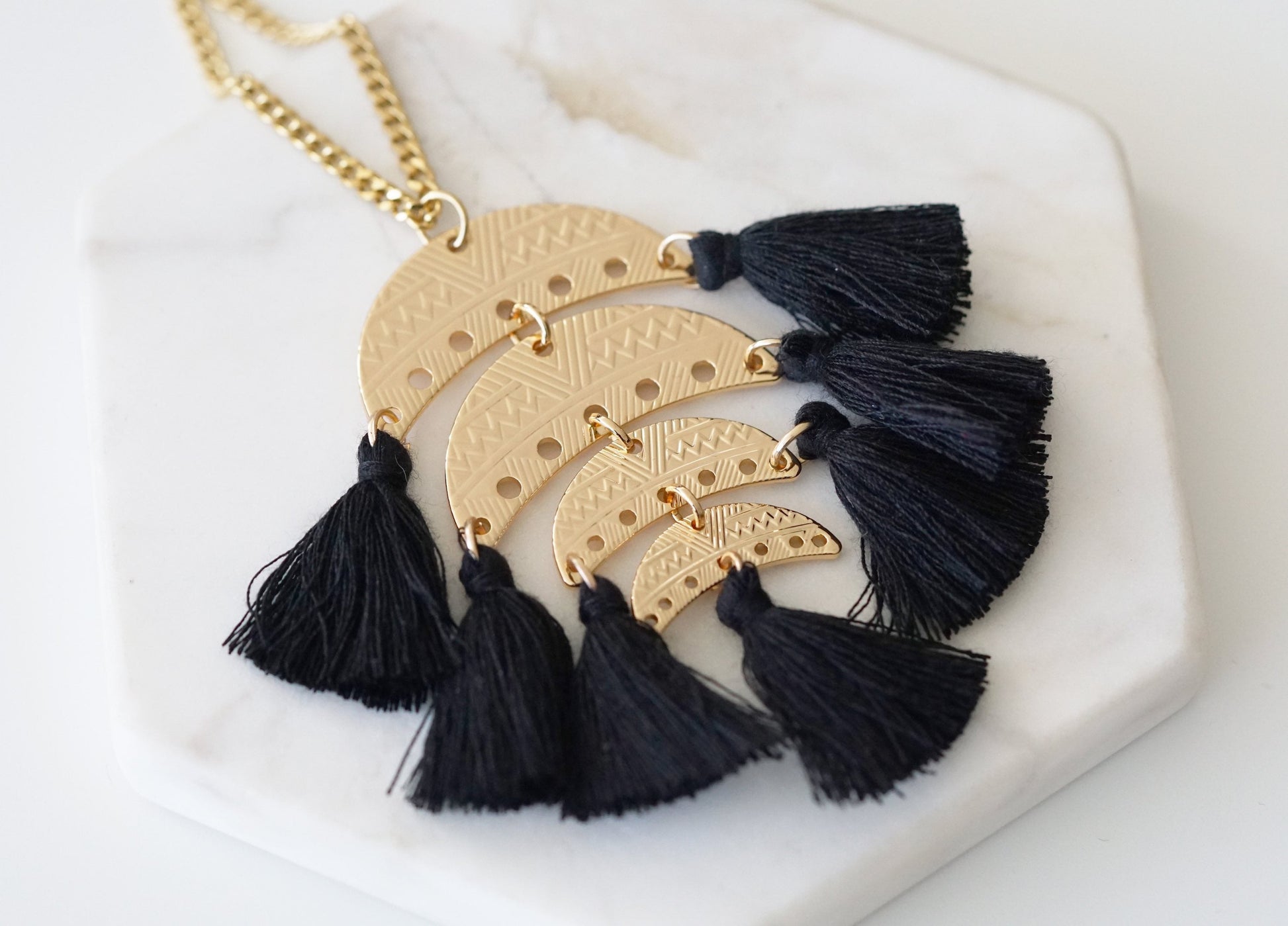 Gold And Black Aztec Boho Fringe Tassel Tiered Hypoallergenic Nickel Free Statement Pendant Necklace. Custom Linen Tassels Accents And Designed With Love In Texas. Size 18 or 32 Inch Length, Plus 3 Inch Attached Necklace Extender With Custom Sizing Available On Select Pieces.