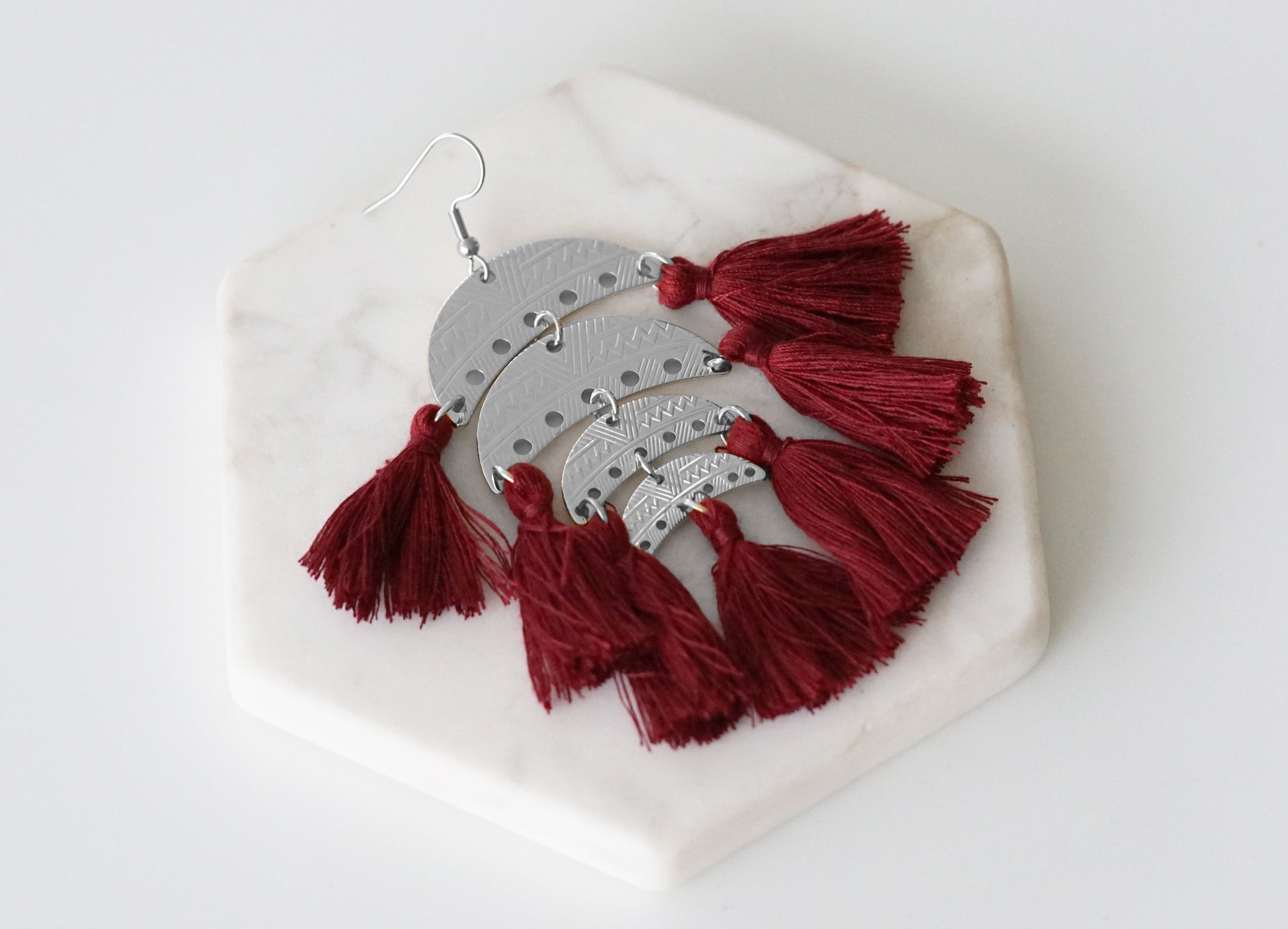 Silver And Red Aztec Boho Fringe Tassel Tiered Mediumweight Hypoallergenic Nickel Free Statement Drop Earrings. Custom Linen Tassels Accents And Designed With Love In Texas. Size 3.5 Inch Length x 1.5 Inch Width With Custom Sizing Available On Select Pieces.