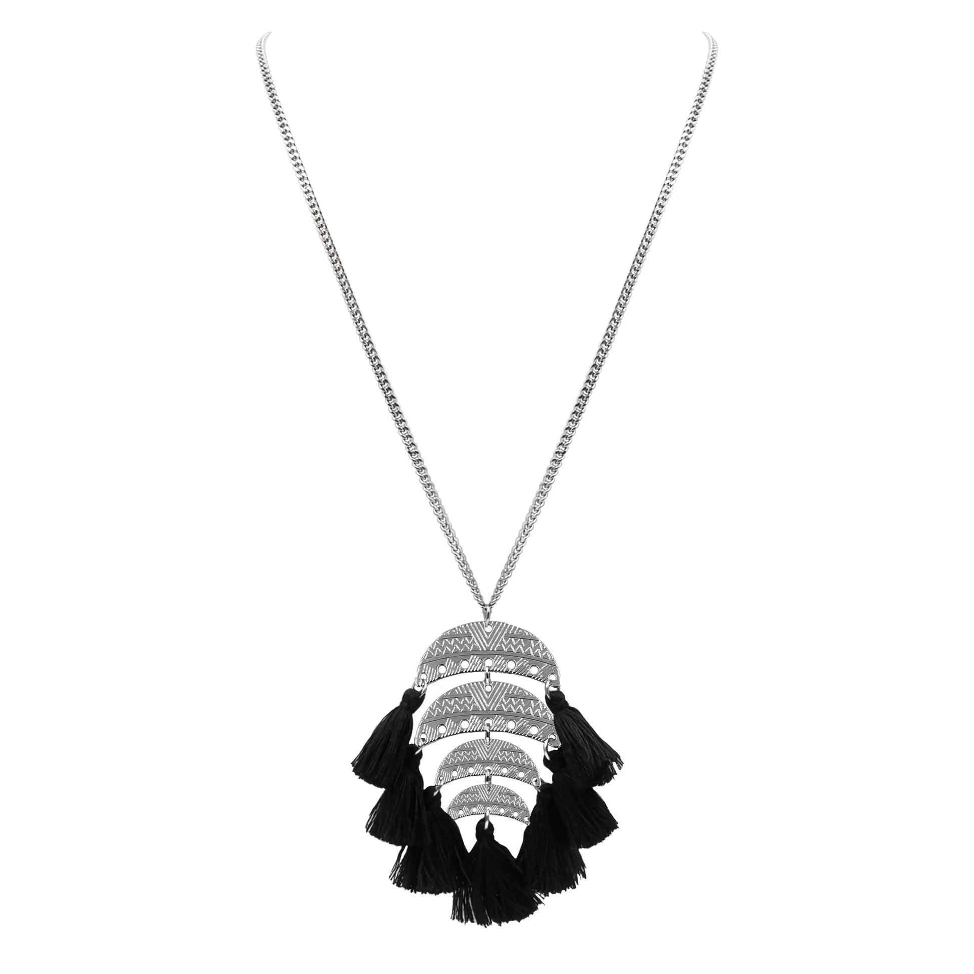Silver And Black Aztec Boho Fringe Tassel Tiered Hypoallergenic Nickel Free Statement Pendant Necklace. Custom Linen Tassels Accents And Designed With Love In Texas. Size 18 or 32 Inch Length, Plus 3 Inch Attached Necklace Extender With Custom Sizing Available On Select Pieces.