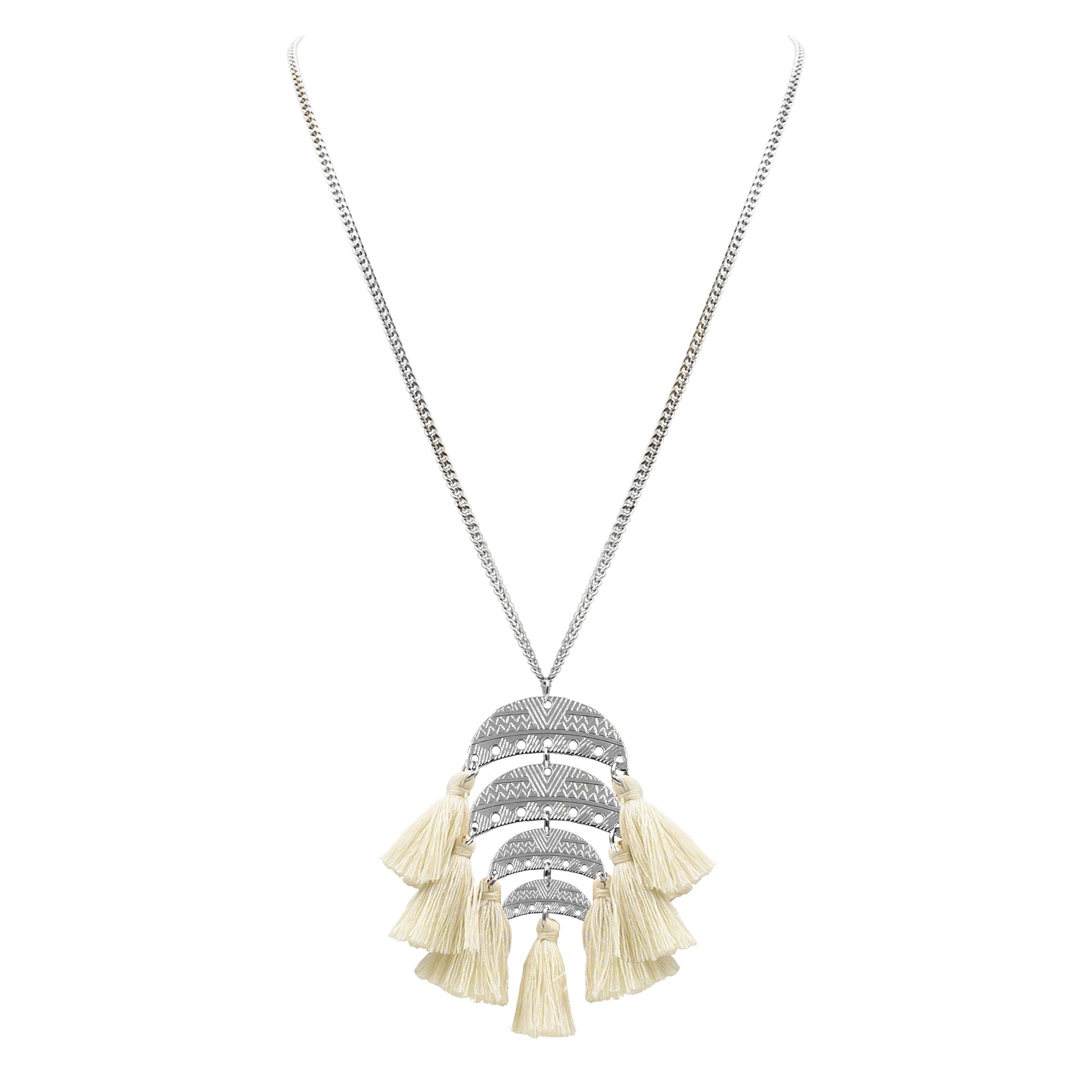 Silver And Brown Aztec Boho Fringe Tassel Tiered Hypoallergenic Nickel Free Statement Pendant Necklace. Custom Linen Tassels Accents And Designed With Love In Texas. Size 18 or 32 Inch Length, Plus 3 Inch Attached Necklace Extender With Custom Sizing Available On Select Pieces.